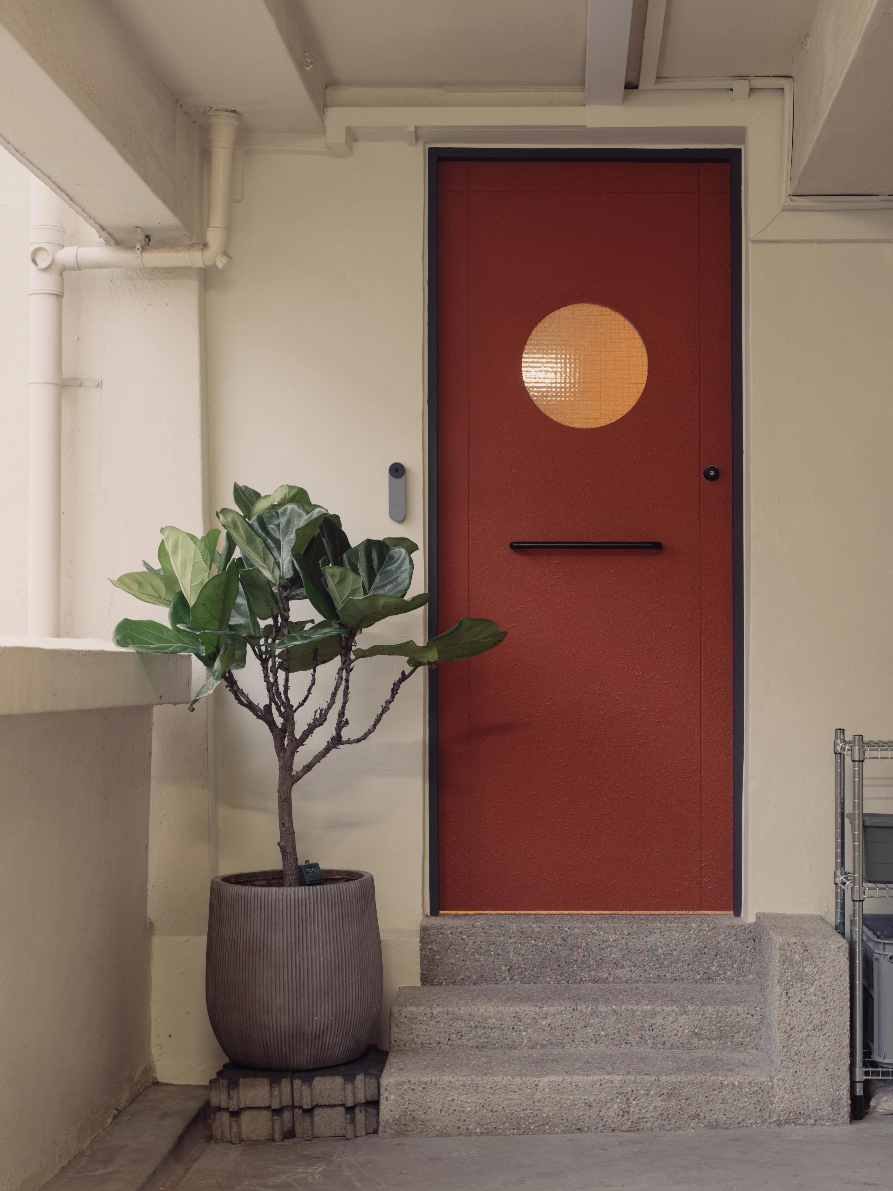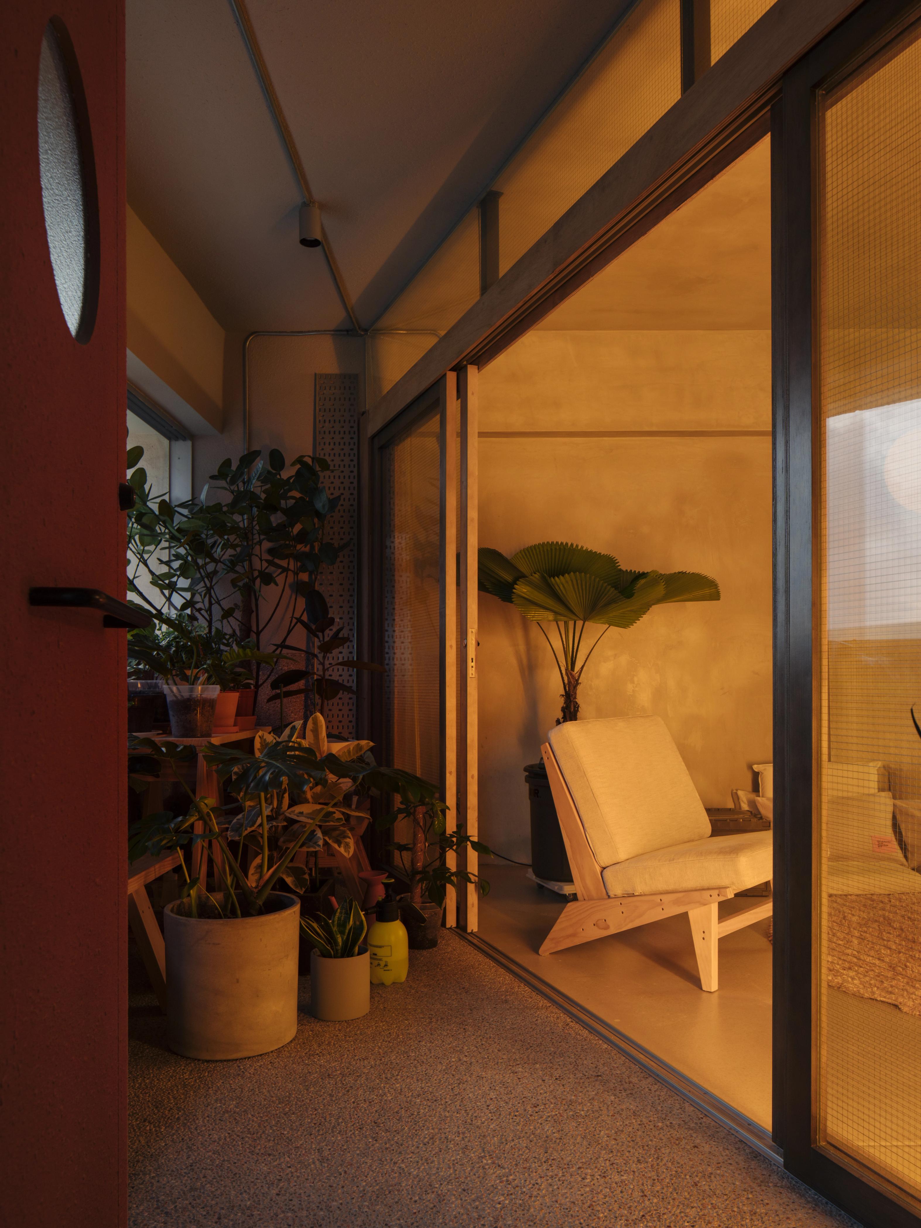 Custom timber-framed sliding glass doors carve out an internal garden veranda from the interior. This gesture references the owner’s childhood memory of arriving home through a porch and garden before entering a terrace house. Set at a slant, the doors amplify perspective upon entry, drawing the eye towards the landscape beyond.